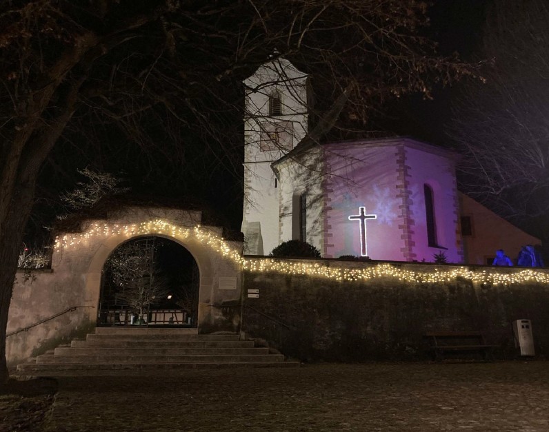 Der Weg zur Kirche und der Innenraum sind von Laternen erleuchtet und schaffen eine warme Atmosphäre. In dieser stimmungsvollen Umgebung gestalten Pfarrerin Elke Hofheinz, Pfarrer Daniel Fischler und Pfarrer Patrick Blickenstorfer einen meditativen Augenblick, in dem sie aus unterschiedlichen Blickwinkeln der Frage nach dem Frieden nachgehen. Im Anschluss erklingen drei Konzerte: